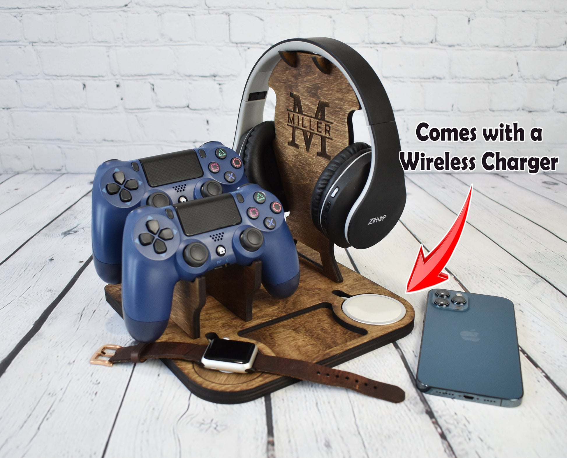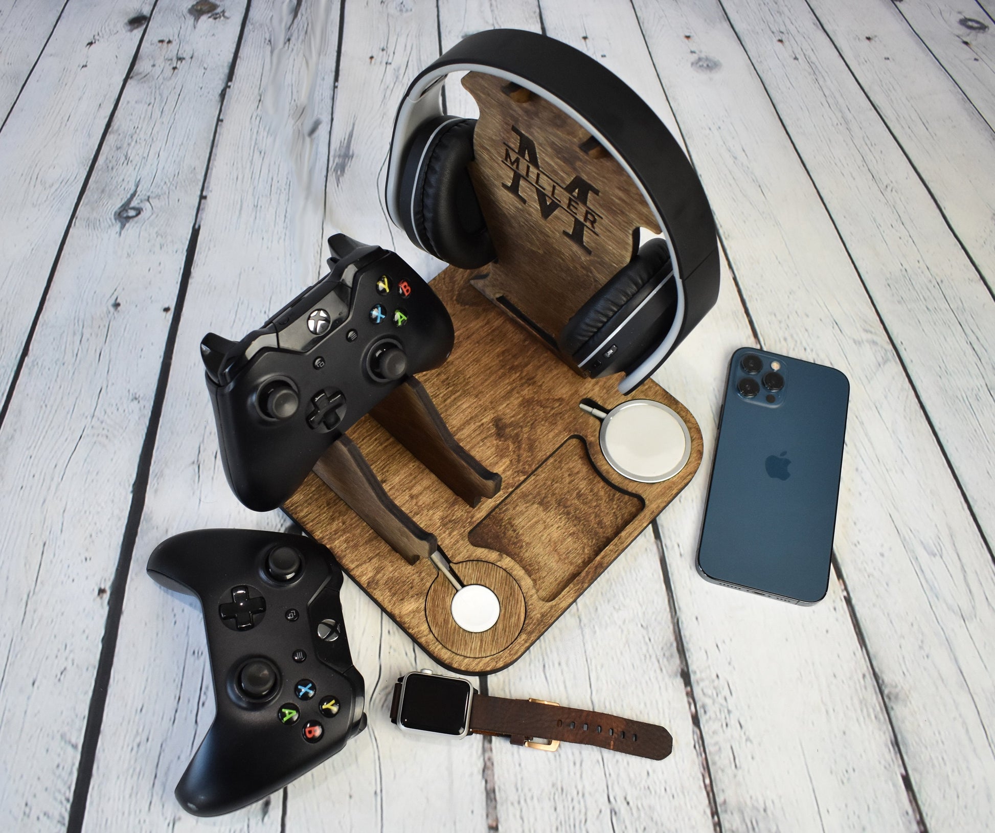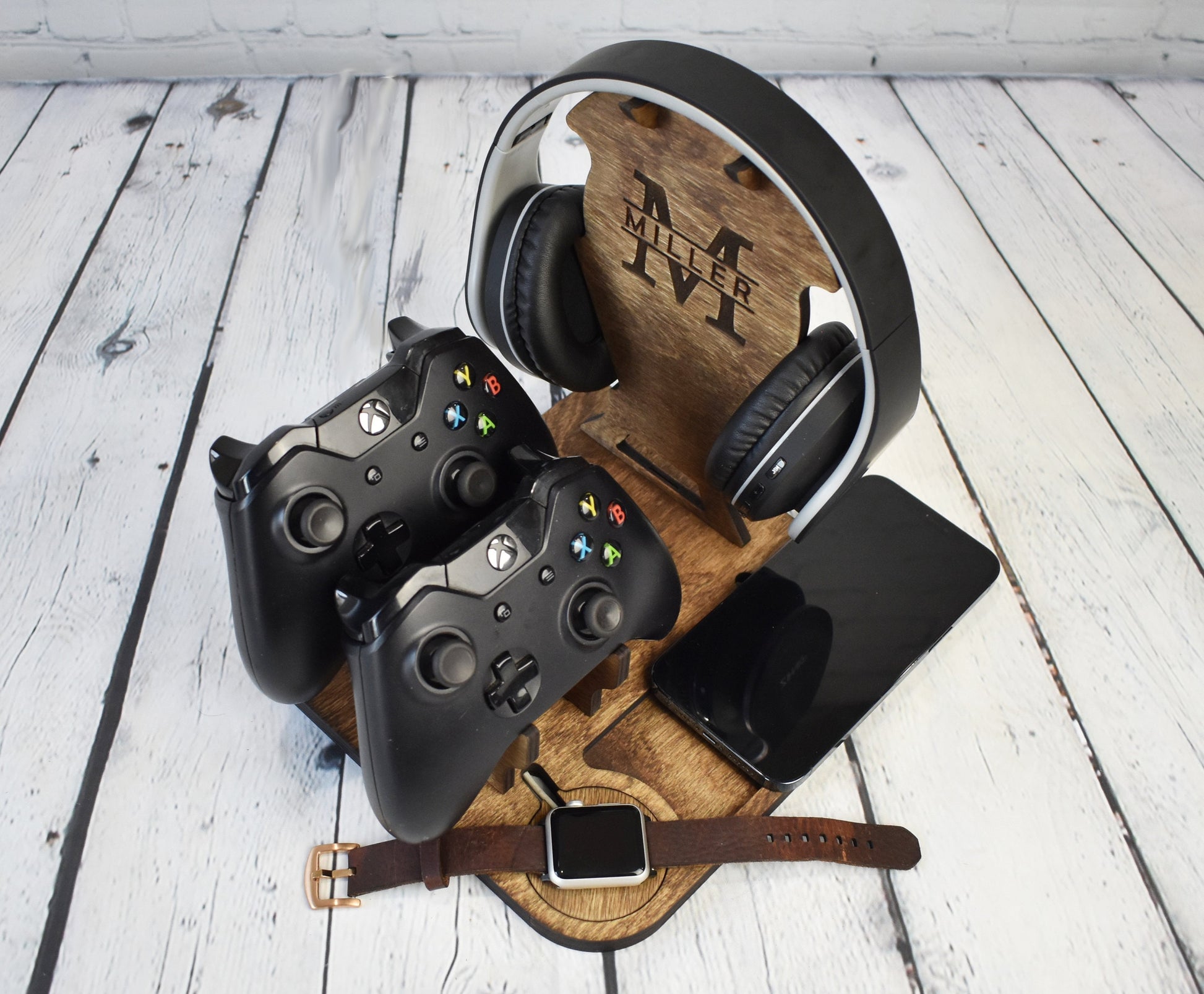 The Personalized Wooden Headphone/Controller Stand is a versatile desk organizer. A stand where you can put your controllers, your headphone and charge your phone/earbud and your smartwatch.