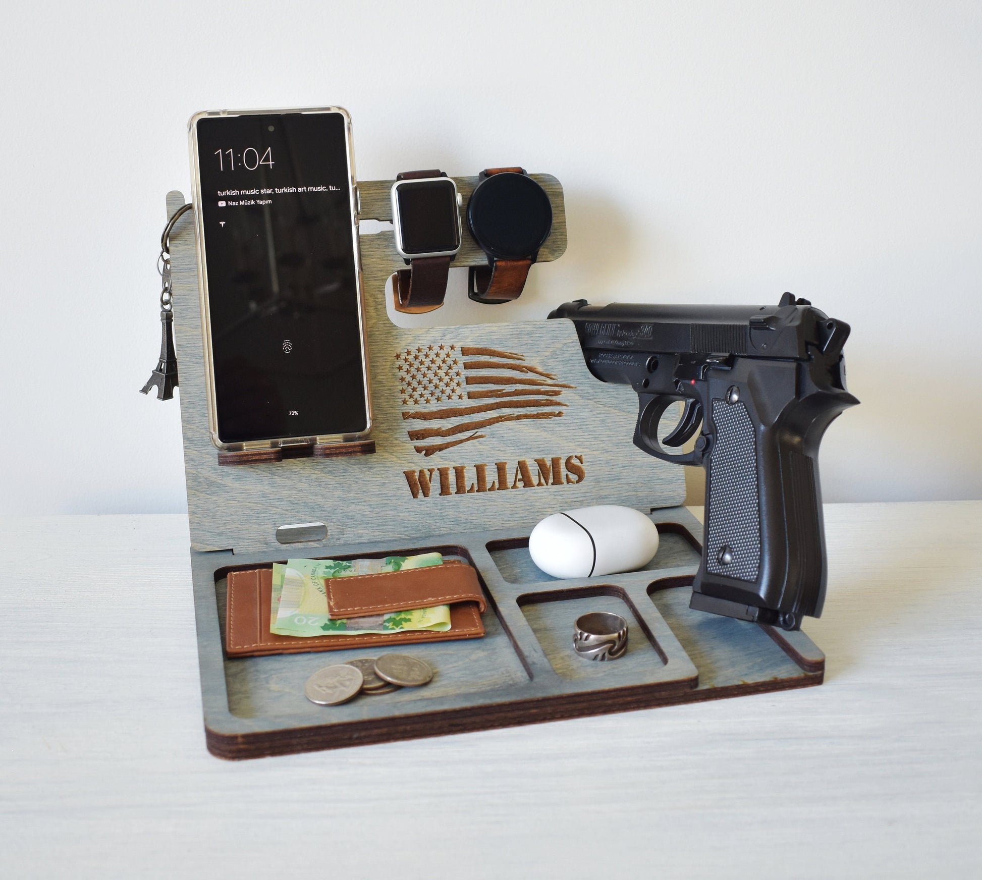 Keywords: Docking Station, New Job Gift, Personalized Gift, Charging Station, Groomsmen Gift, Desk Organizer, Wood Phone Stand, Mens Gift, Tech Gifts, Wood docking station, catch them all, caddy, desk organizer, wooden docking station, docking station, nightstand docking station, dock, docking, phone docking, gift for him. gift for her, gift for men, gift for father, gift for dad, gift for mom, gift for mother, gift for boyfriend, gift for girlfriend, anniversary gift, birthday gift, valentines day gift, fathers day gift, mothers day gift, retirement gift. teachers day gift, gift for teacher, graduation gift, groomsmen gift idea, Police officer Docking Station, Wood Stand for gun, Law enforcement Gift for men, Nightstand with gun holder.