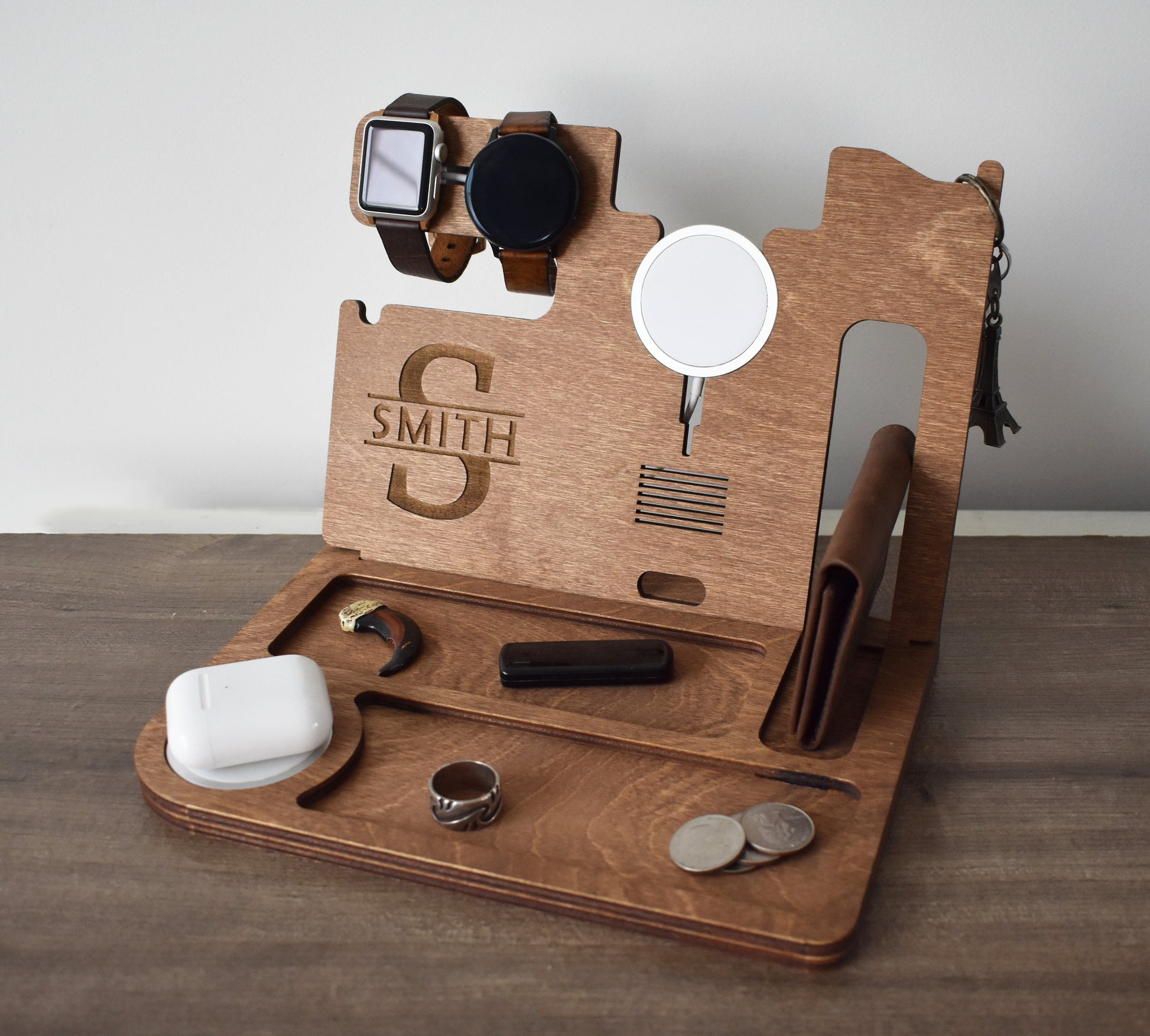 Keywords: Docking Station, MagSafe, Magsafe Charger, New Job Gift, Personalized Gift, Charging Station, Groomsmen Gift, Desk Organizer, Wood Phone Stand, Men’s Gift, Tech Gifts, Wood docking station, catch them all, caddy, desk organizer, wooden docking station, docking station, nightstand docking station, dock, docking, phone docking, gift for him, gift for her.