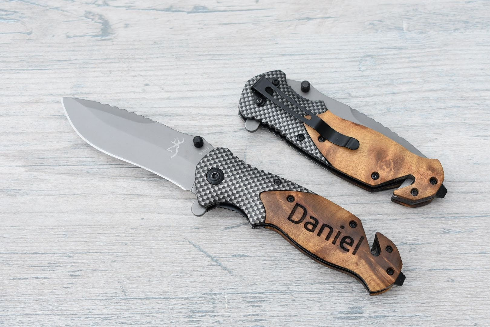 I can engrave and personalize the handle of the knife with a name or text! Preferably 1 or 2 lines of text is best, but 3 lines is also possible. There is no engraving option on the back side because of the belt clip.