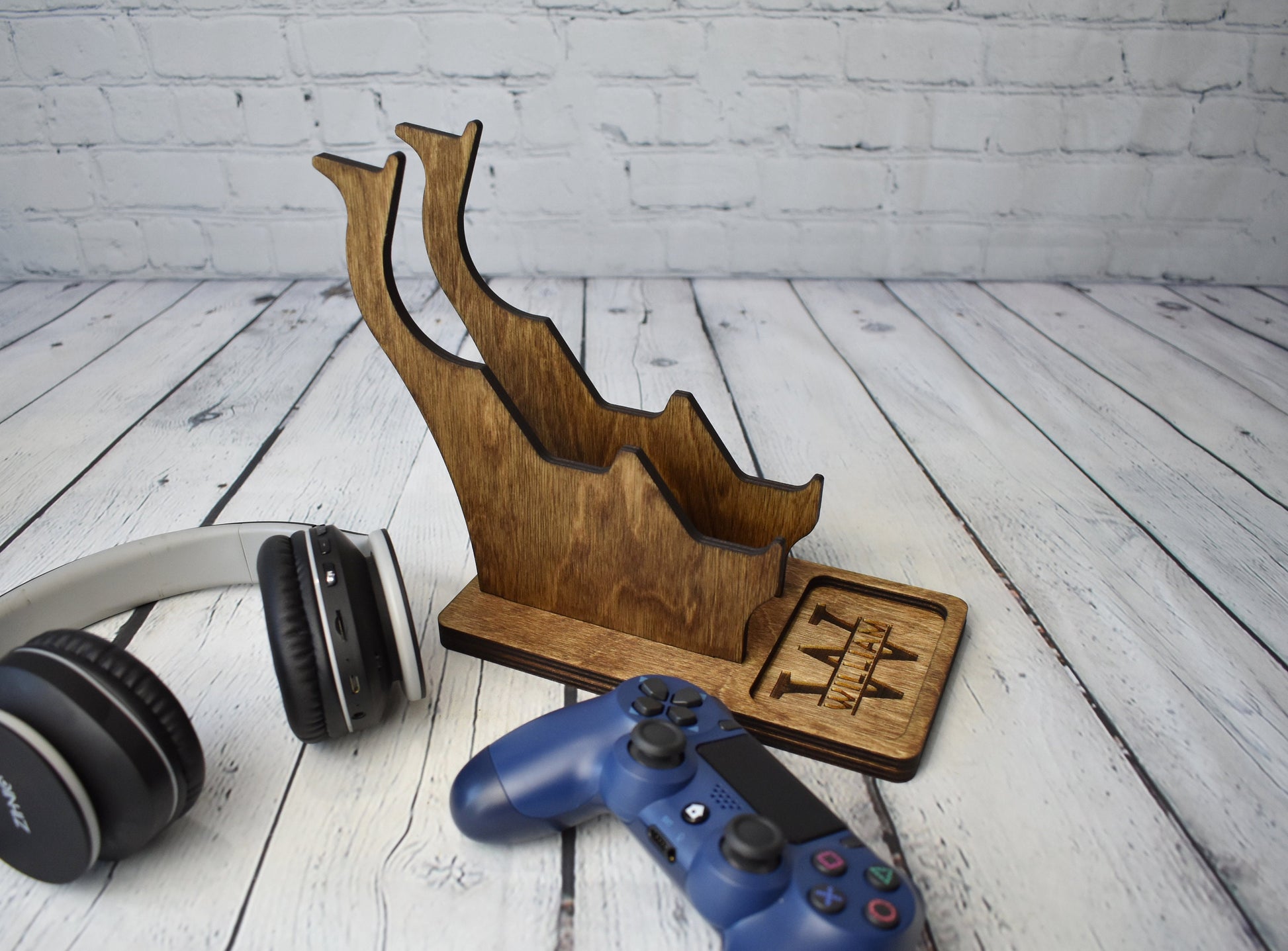 It is made of high-quality birch plywood and stained by hand. Laser engraving is available for extra special personal touch. Easy to assemble, designed to universally fit all regular gaming controllers and headsets. Headphone stand is perfectly shaped as to not stretch the headband.